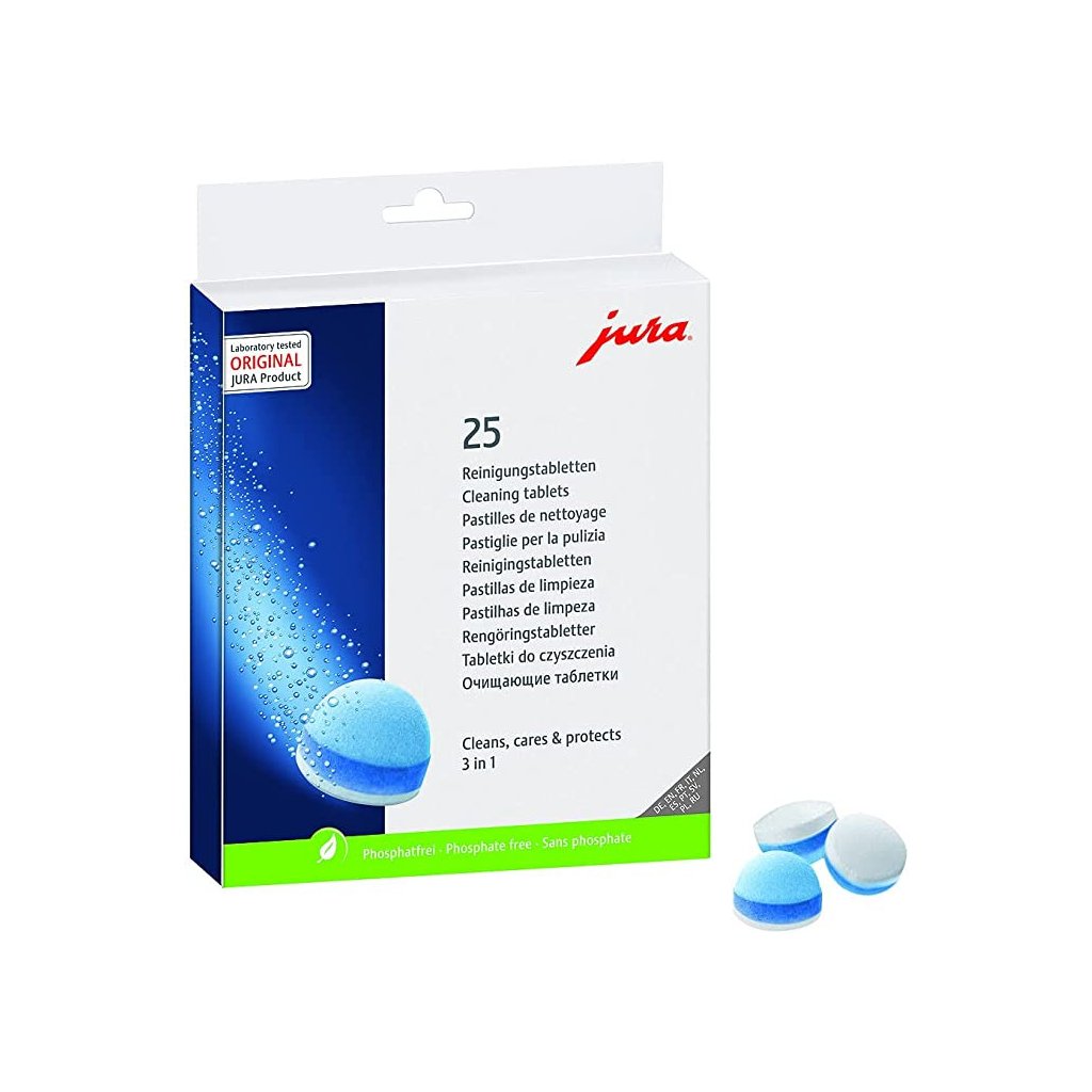 Čisticí tablety 3fázové, které chrání kávovar před usazováním minerálů. Mají certifikaci TÜV, garantující čistotu a hygienu. Neobsahují žádné fosfáty. Balení obsahuje 25 ks.