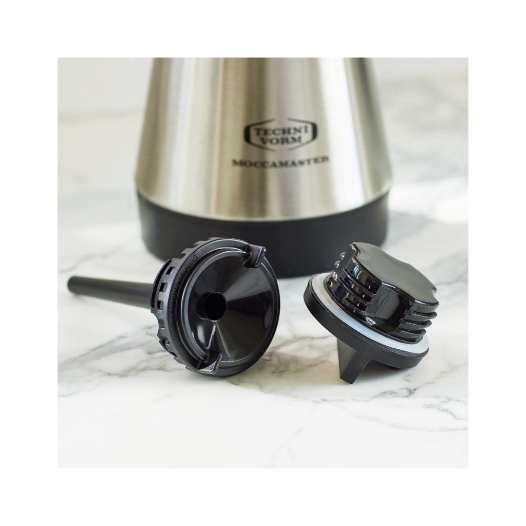 Překapávač je také vybaven funkcí drip-stop a při odejmutí termosky se automaticky zastaví překapávání. Připravená káva vydrží v termosce minimálně 1 hodinu stále teplá, případně déle, je-li termoska uzavřená.