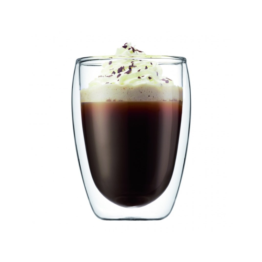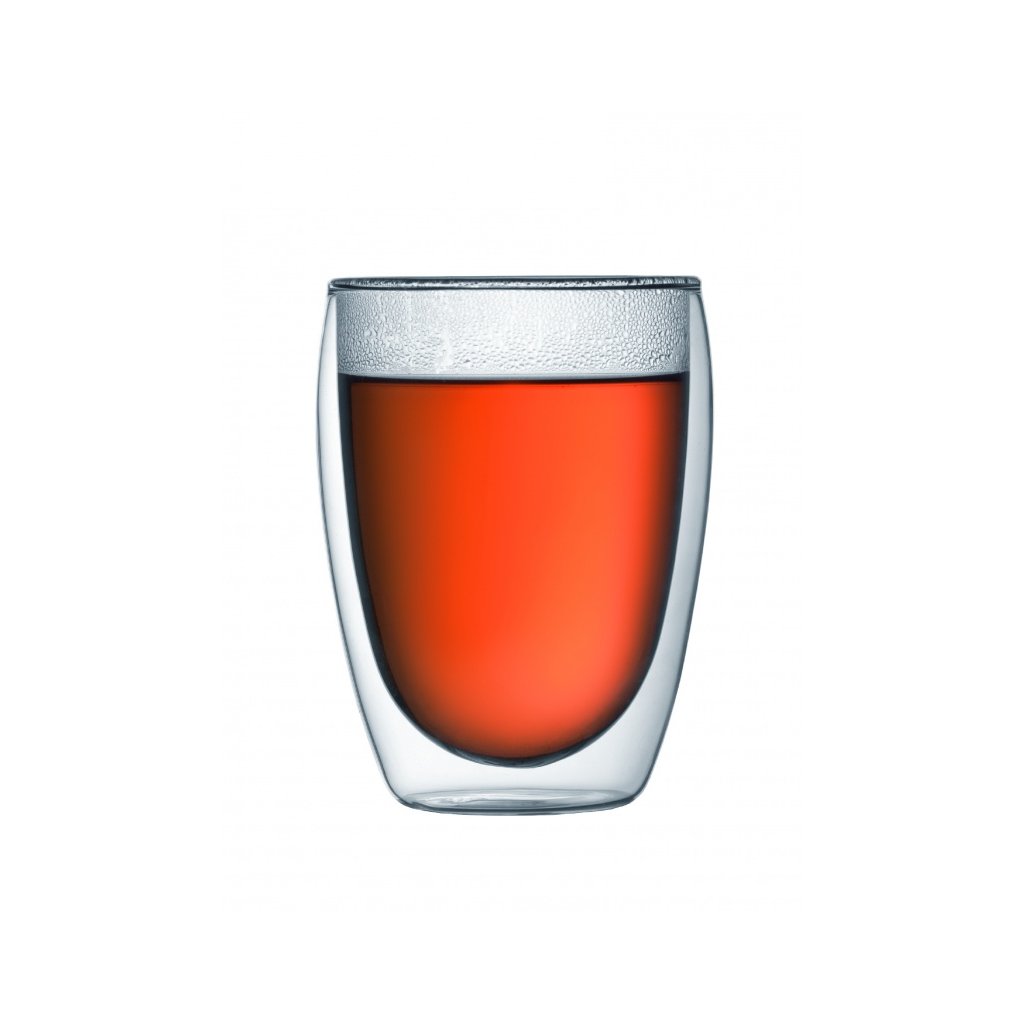 Ve spodní části dvoustěnných Bodum skleniček je umístěn silikonový otvor, díky kterému je vyrovnán tlak vzduchu mezi oběma vrstvami, když se do skleničky přidá horká nebo studená tekutina. Proto můžete skleničku bez obav vzít a nespálit se, a zároveň ani nedochází ke kondenzaci vody. Sklenice se tudíž nerosí a nezanechává fleky. Objem skleničky je 350 ml, výška je 115 mm. Lze je mýt v myčce nádobí, můžete je dát do mikrovlnné trouby a bez problému snesou i pobyt v troubě nebo v mrazáku.