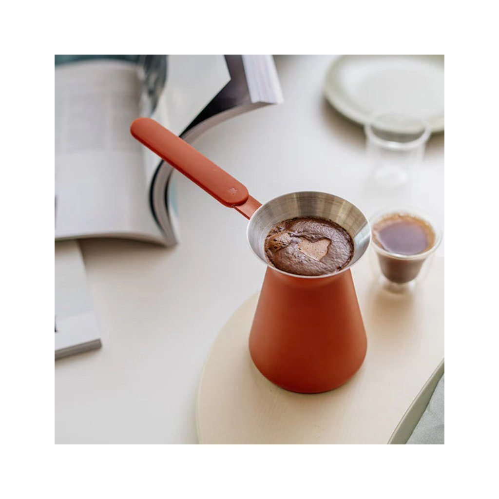 Džezva na přípravu tradiční turecké kávy v moderním kabátku. Od slovinské značky Goat Story. V krásném cihlově červeném provedení.